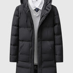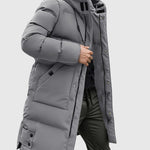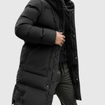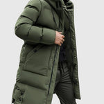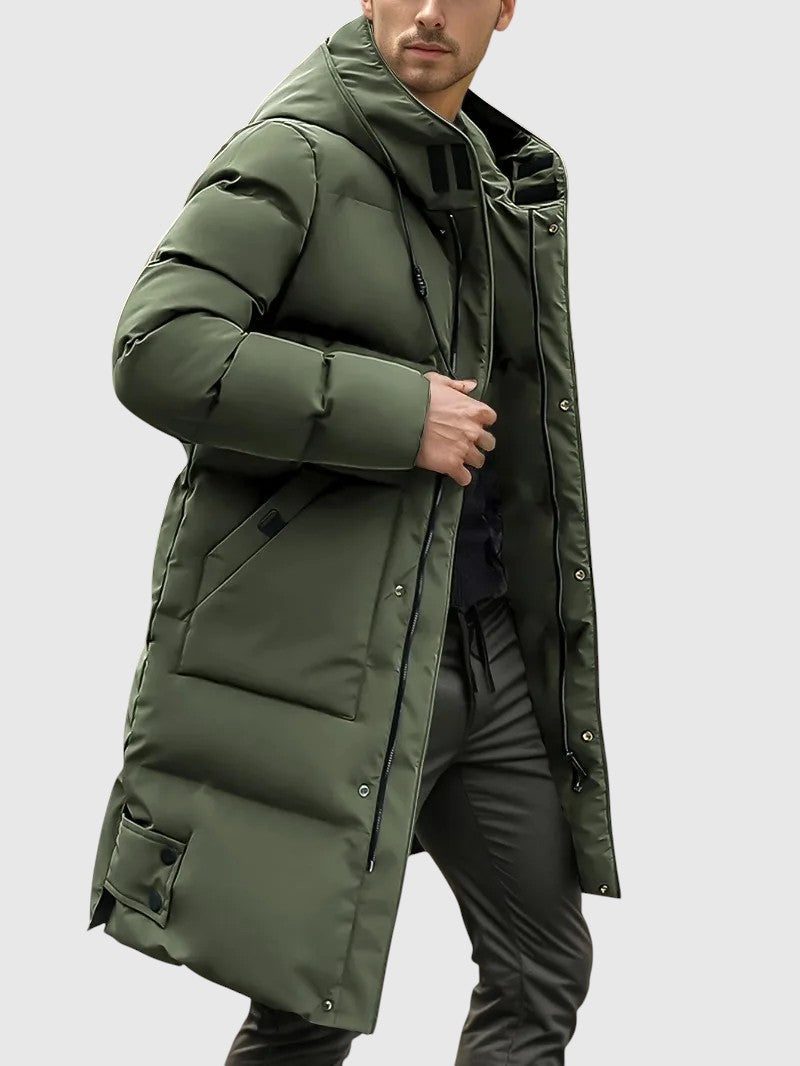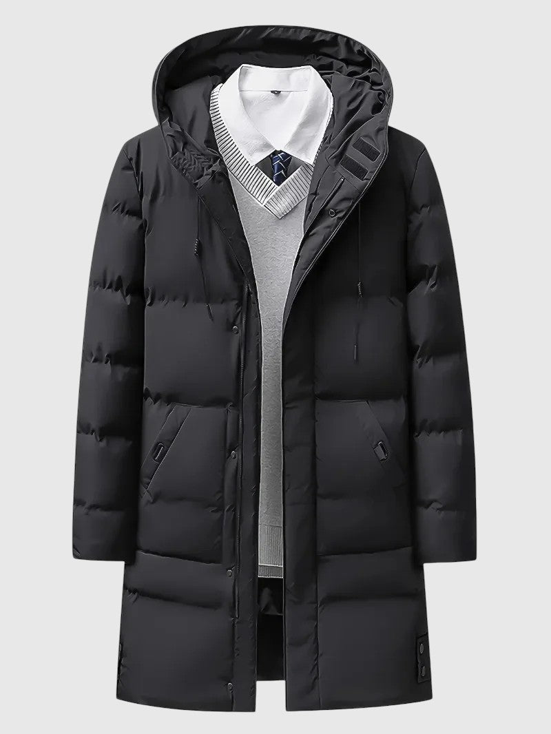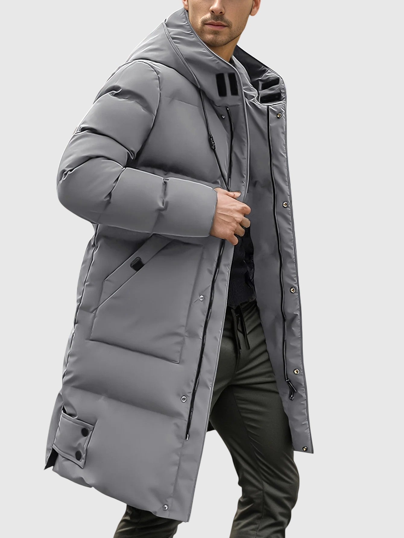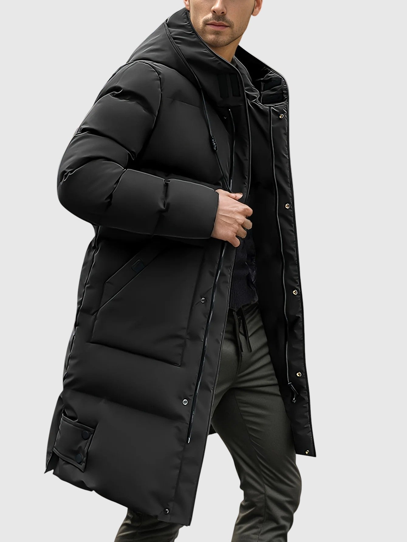 Dlouhý kabát s moderním střihem, navržený tak, aby poskytoval maximální ochranu a pohodlí v chladných dnech. Prošívaná výplň zajišťuje účinnou izolaci, zatímco kapuce a vysoký límec posiluje ochranu proti větru a nízkým teplotám. Funkční kapsy a zapínání na knoflíky dodávají praktičnost elegantního designu, díky čemuž je tento kousek univerzální pro městský život i volný čas.