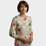 Tento svetr přináší veselou vánoční atmosféru díky svému svěžímu růžovému a zelenému potisku borovic. Kombinace jemných barev a subtilních pruhů dodává moderní nádech klasickému svátečnímu vzhledu. Vyrobeno z teplé pletené směsi bavlny pro maximální pohodlí.