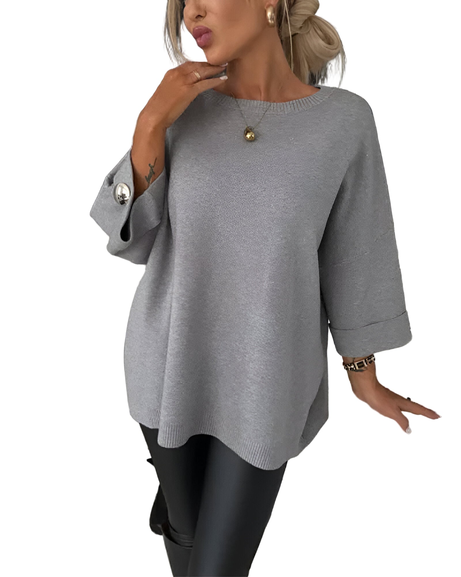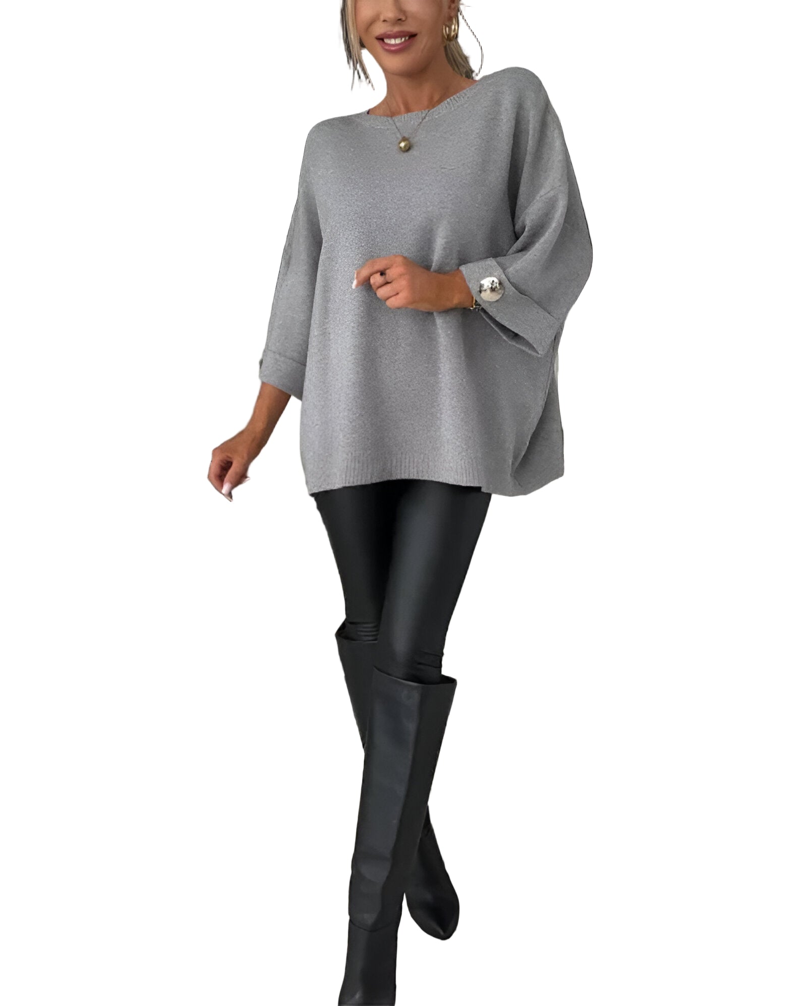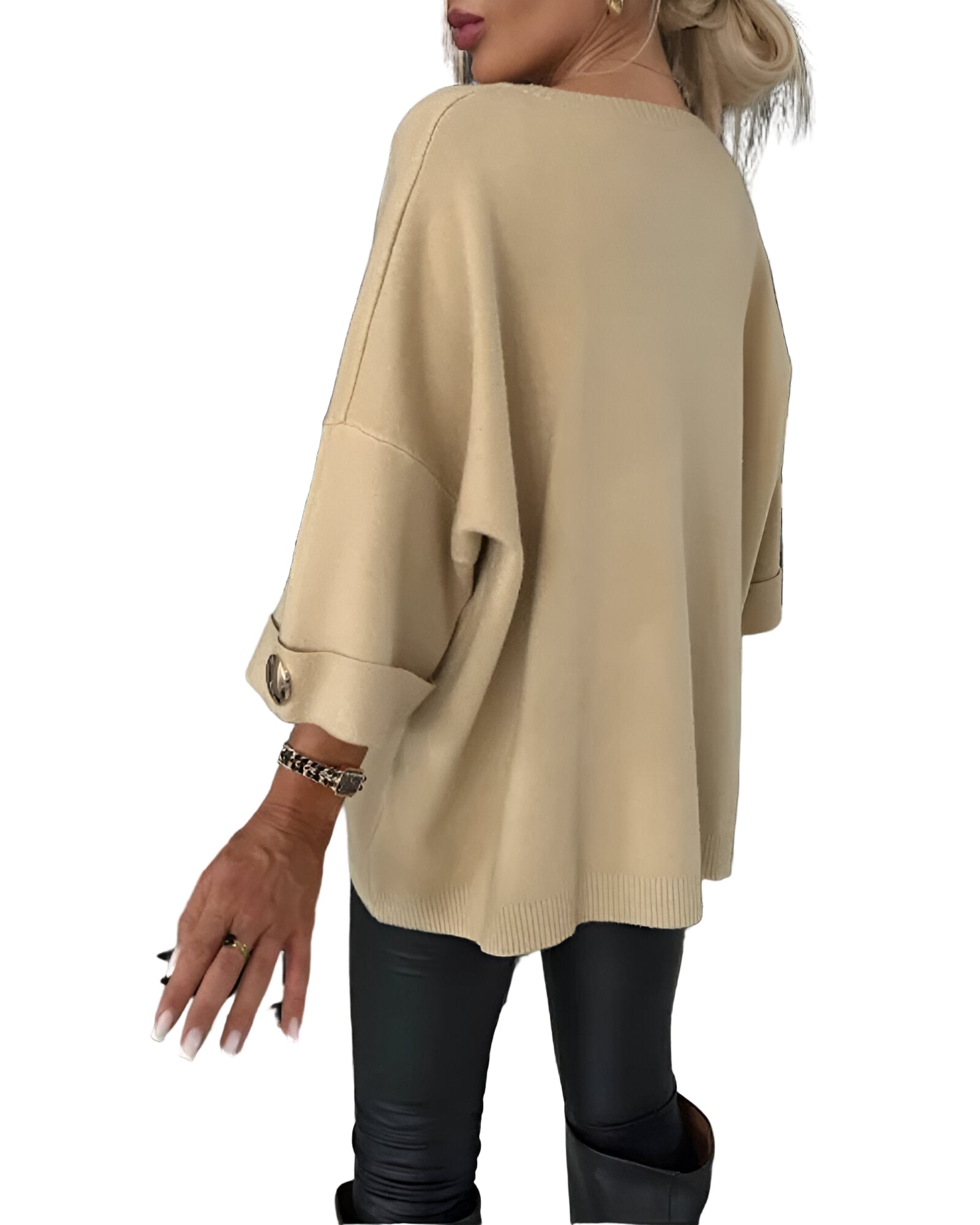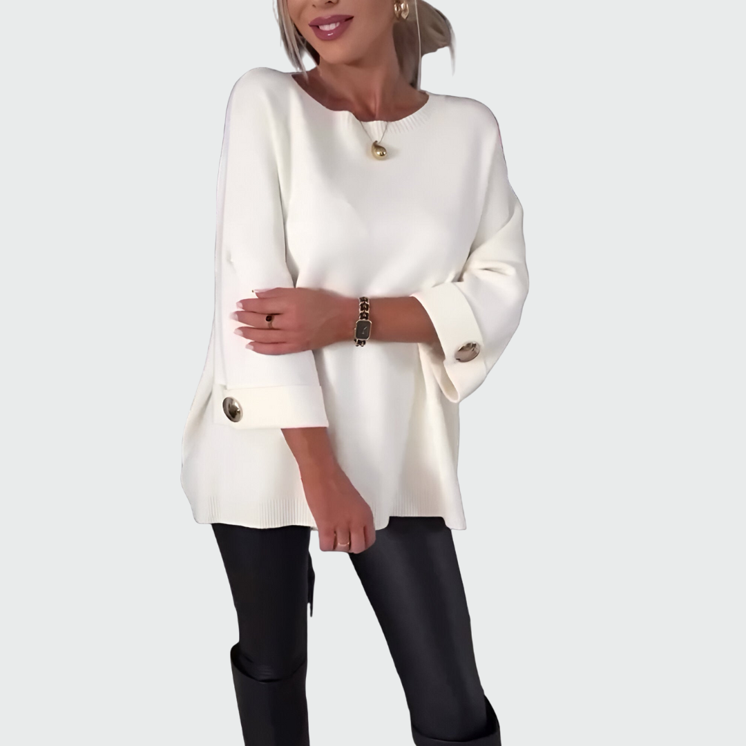 Tento svetr je dokonalým spojením pohodlí a elegance. Volný střih zajišťuje maximální komfort a svobodu pohybu, zatímco detaily v podobě ozdobných knoflíků dodávají moderní a šik vzhled. Ideální volba pro každodenní nošení i speciální příležitosti, kdy chcete vypadat sebevědomě a cítit se skvěle.