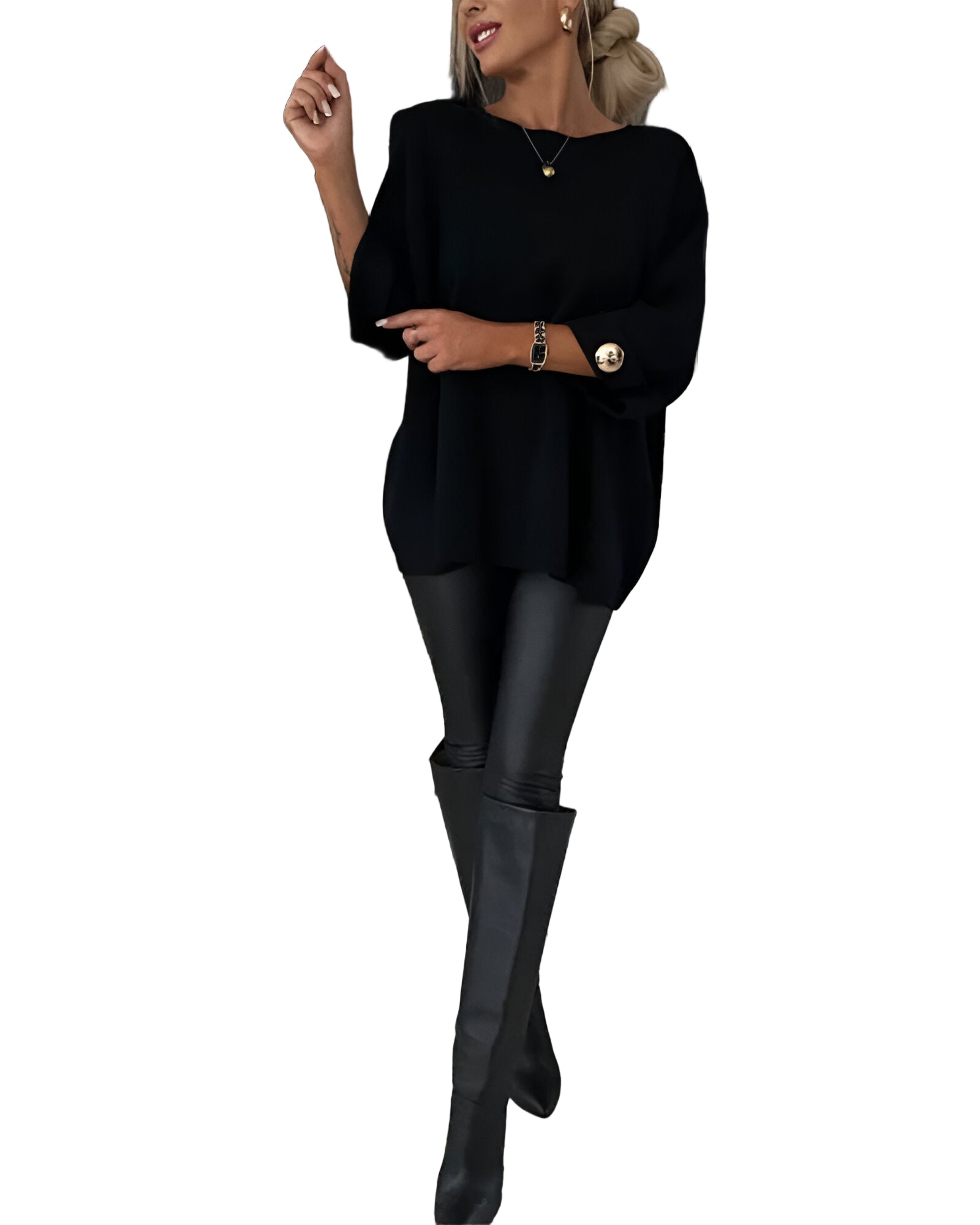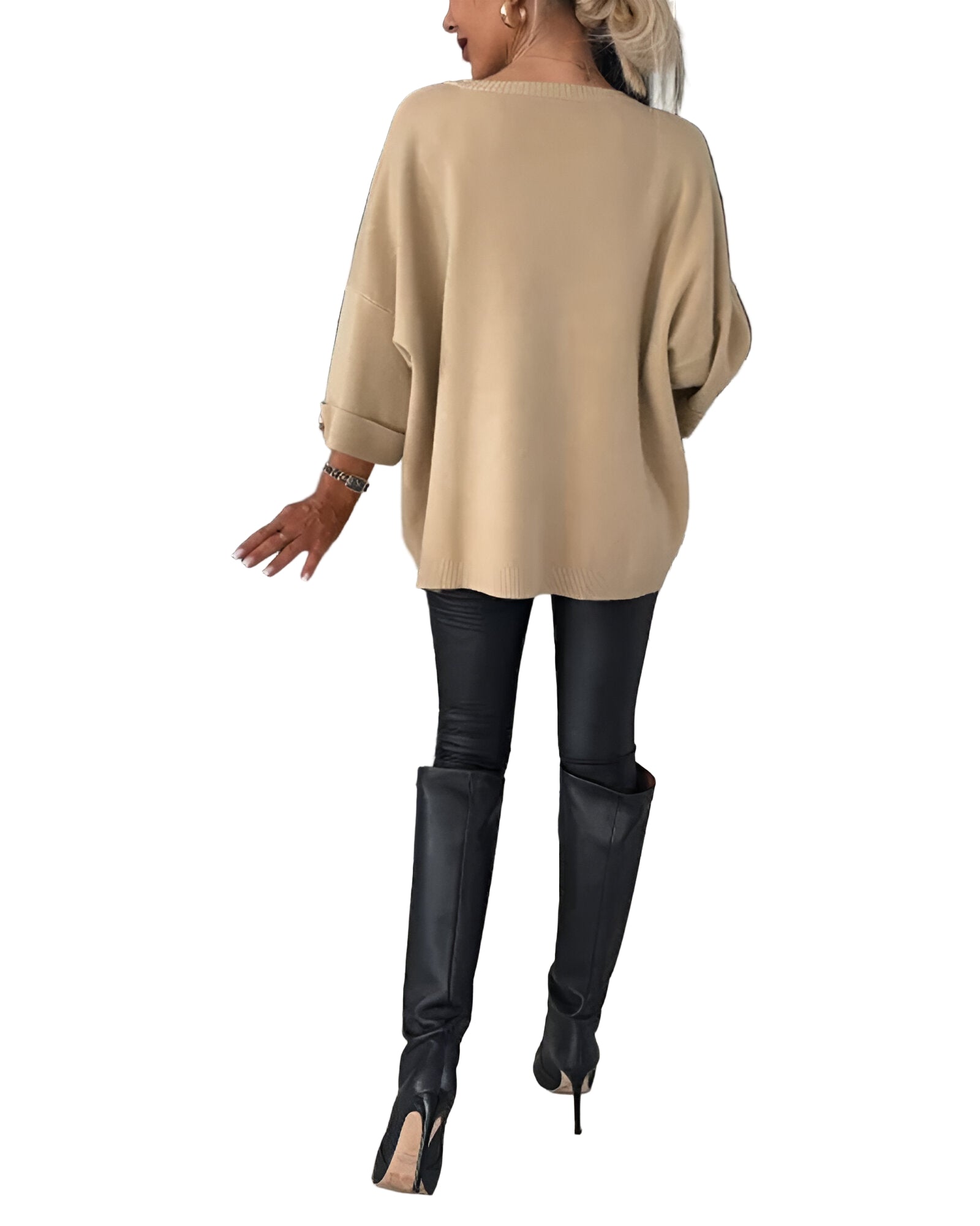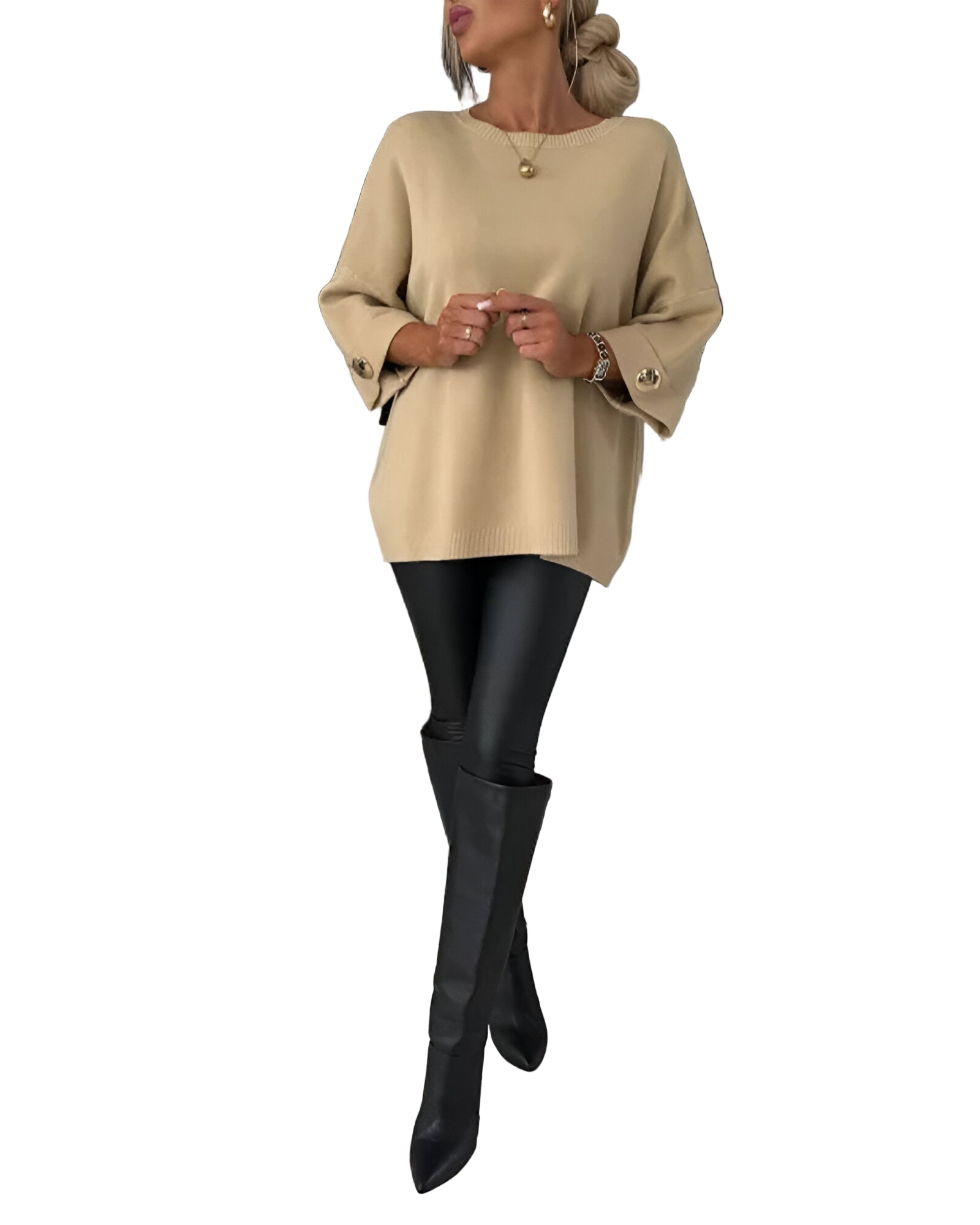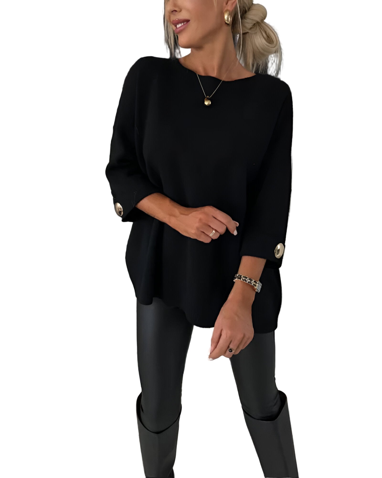 Tento svetr je dokonalým spojením pohodlí a elegance. Volný střih zajišťuje maximální komfort a svobodu pohybu, zatímco detaily v podobě ozdobných knoflíků dodávají moderní a šik vzhled. Ideální volba pro každodenní nošení i speciální příležitosti, kdy chcete vypadat sebevědomě a cítit se skvěle.