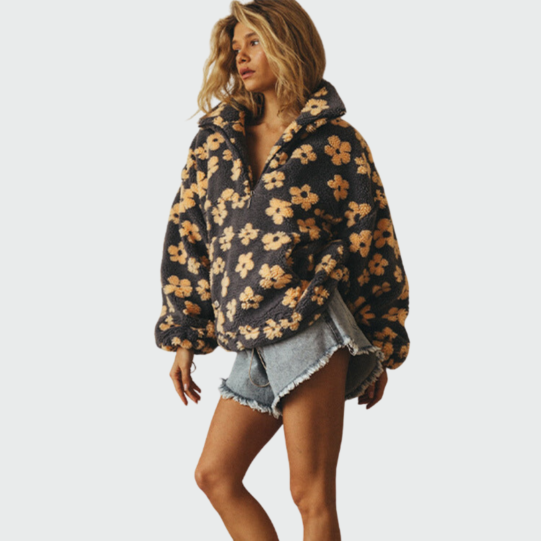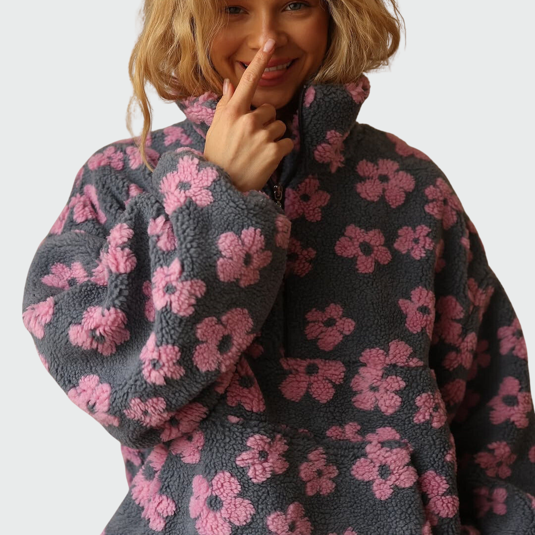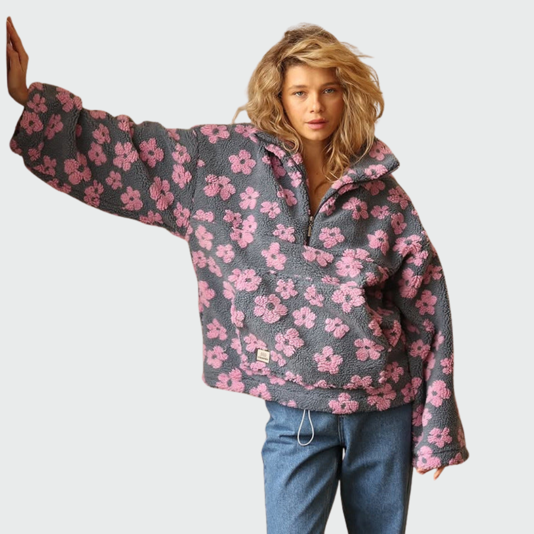 Zahalte se do pohodlí a stylu s tímto měkoučkým kouskem, který spojuje hravost květin s maximálním komfortem. Perfektní na chladnější dny – ať už jdete na procházku, do města nebo si užíváte odpočinek doma. Květinový design dodává pozitivní energii, zatímco příjemný materiál vás udrží v teple. Snadno kombinovatelný s džíny i legínami pro ležérní, ale výrazný vzhled.