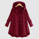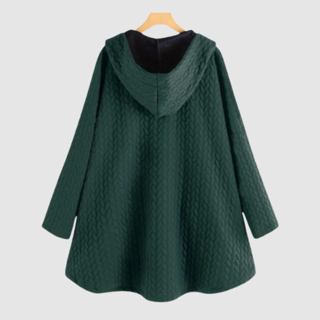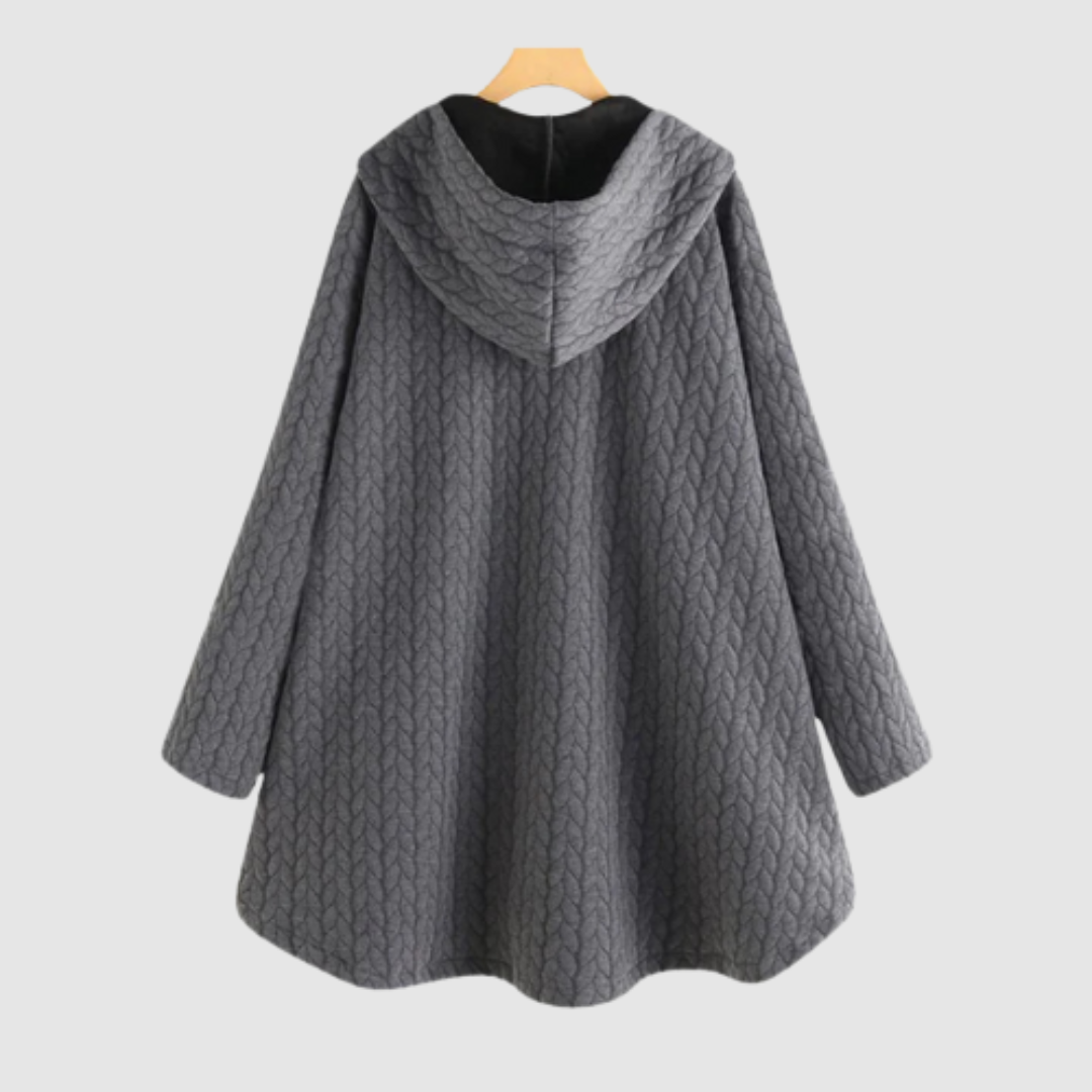 Tento kabát kombinuje moderní design s maximálním pohodlím. Díky volnému střihu, měkkému materiálu a praktickému kapuci je ideální pro každodenní nošení i volnočasové aktivity. Ozdobné knoflíky na stranách dodávají outfit jedinečný a elegantní nádech.