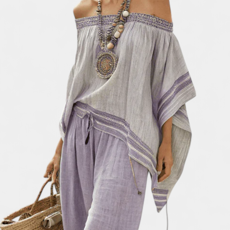 Bambusový top s pruhy, s odhalenými rameny a širokými kalhotami pro elegantní a svěží styl