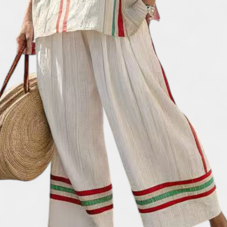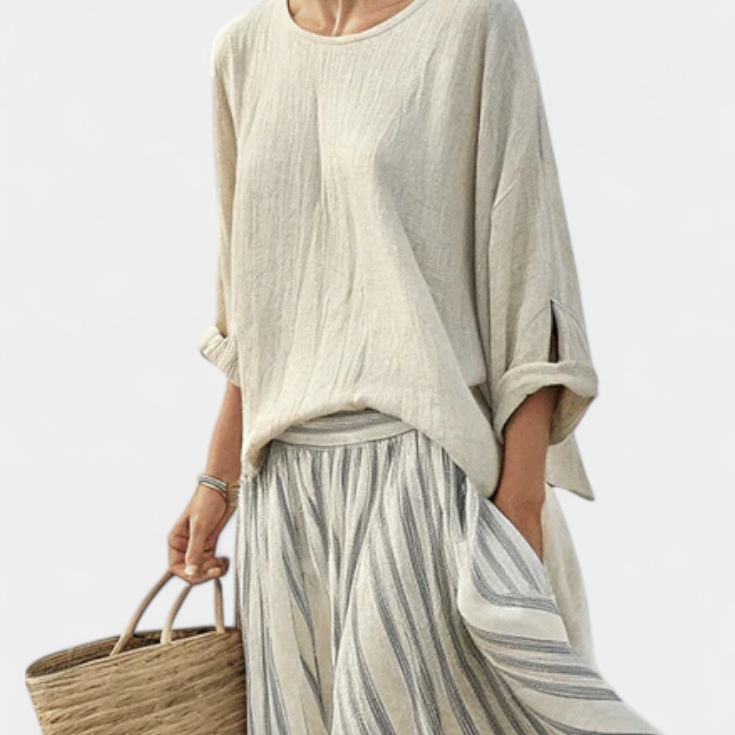 Souprava z bambusového lnu Daisy s elegantním pruhovaným tričkem a volnými kalhotami pro moderní a pohodlný styl