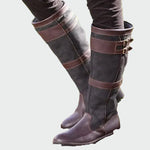 Dámské **vysoké jezdecké boty** v kombinaci hnědé a tmavě šedé barvy, které vyzařují eleganci a praktičnost. **Dvojité přezky** na horní části a zesílené švy zajišťují odolnost a pevné uchycení, zatímco klasický design je činí ideálními pro každou příležitost – od casual vzhledů po outdoorové aktivity.