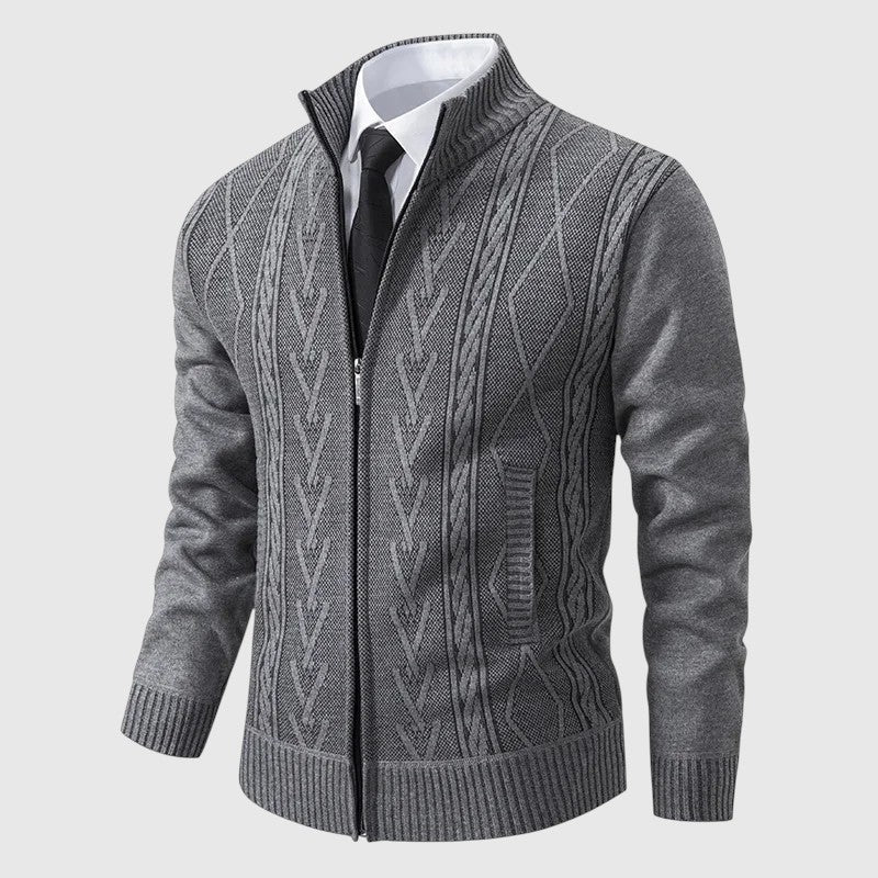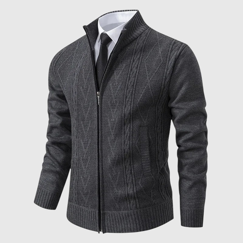 Elegantní a univerzální pletený svetr, ideální pro moderní a pohodlný vzhled. Celopropínací zip usnadňuje nošení a dodává praktičnost, zatímco vysoký límec poskytuje lepší ochranu proti chladu. Přední pletený vzor přidává sofistikovaný detail a boční kapsy zvyšují funkčnost. Tento kousek se snadno kombinuje s ležérními i elegantnějšími outfity, a je tak vhodný pro každodenní nošení i uvolněné pracovní prostředí.