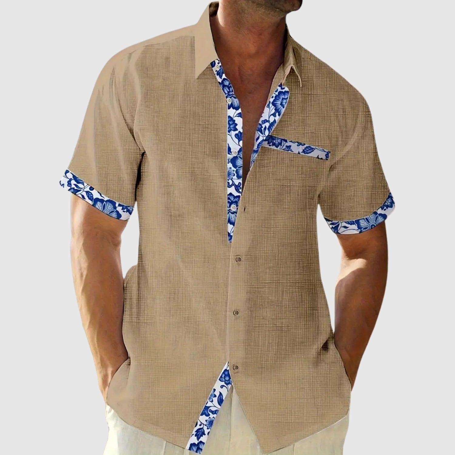 Tato košile s krátkými rukávy, navržená pro slunečné dny, kombinuje svěžest a eleganci s nádechem živosti. Kontrastní detaily na límci, kapse a rukávech dodávají charakteru uvolněnému vzhledu, který je ideální na pláž, do města nebo na letní výlet.