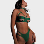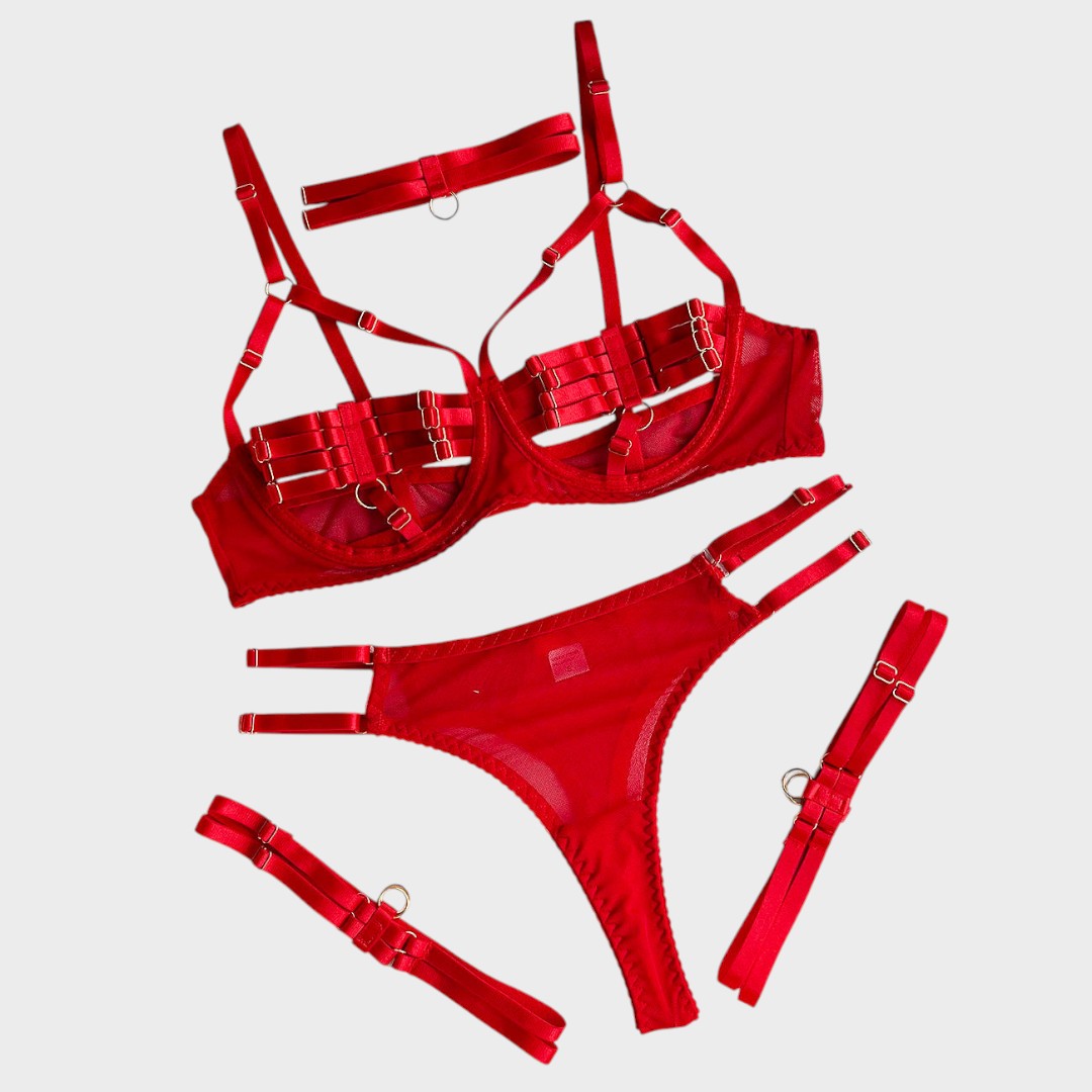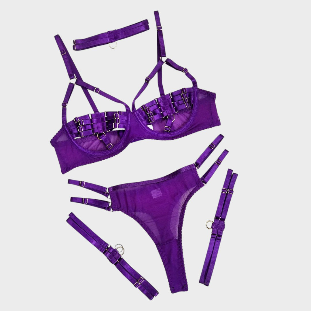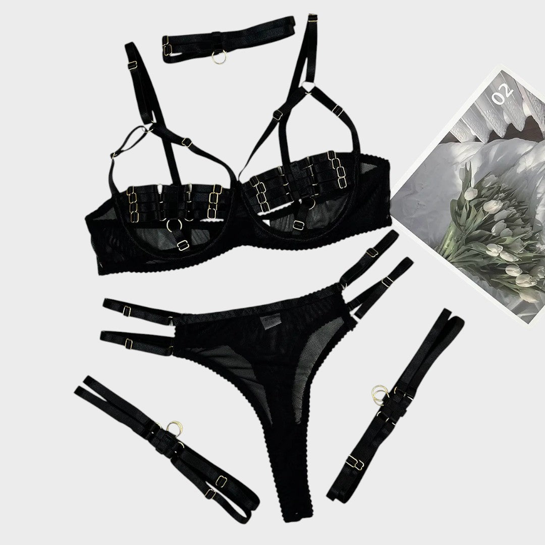 Objevte Amanda | 4-dílnou soupravu spodního prádla, která spojuje eleganci, komfort a styl v dokonalé harmonii. Tato exkluzivní souprava, složená z podprsenky, kalhotek, chokeru a podvazků, nabízí nejen svůdné sexy prádlo, ale také pocit luxusu, který potěší každou ženu. Vyrobeno z vysoce kvalitního polyesteru, souprava zajišťuje příjemný pocit při nošení a perfektní střih, který optimálně zvýrazní vaše křivky.