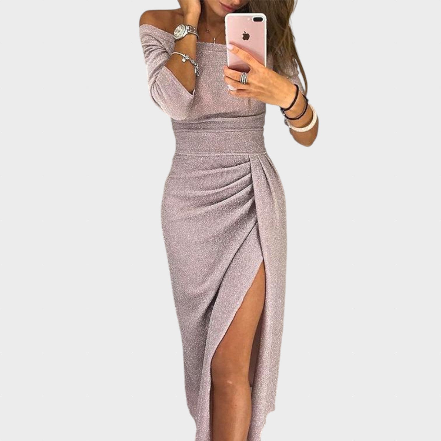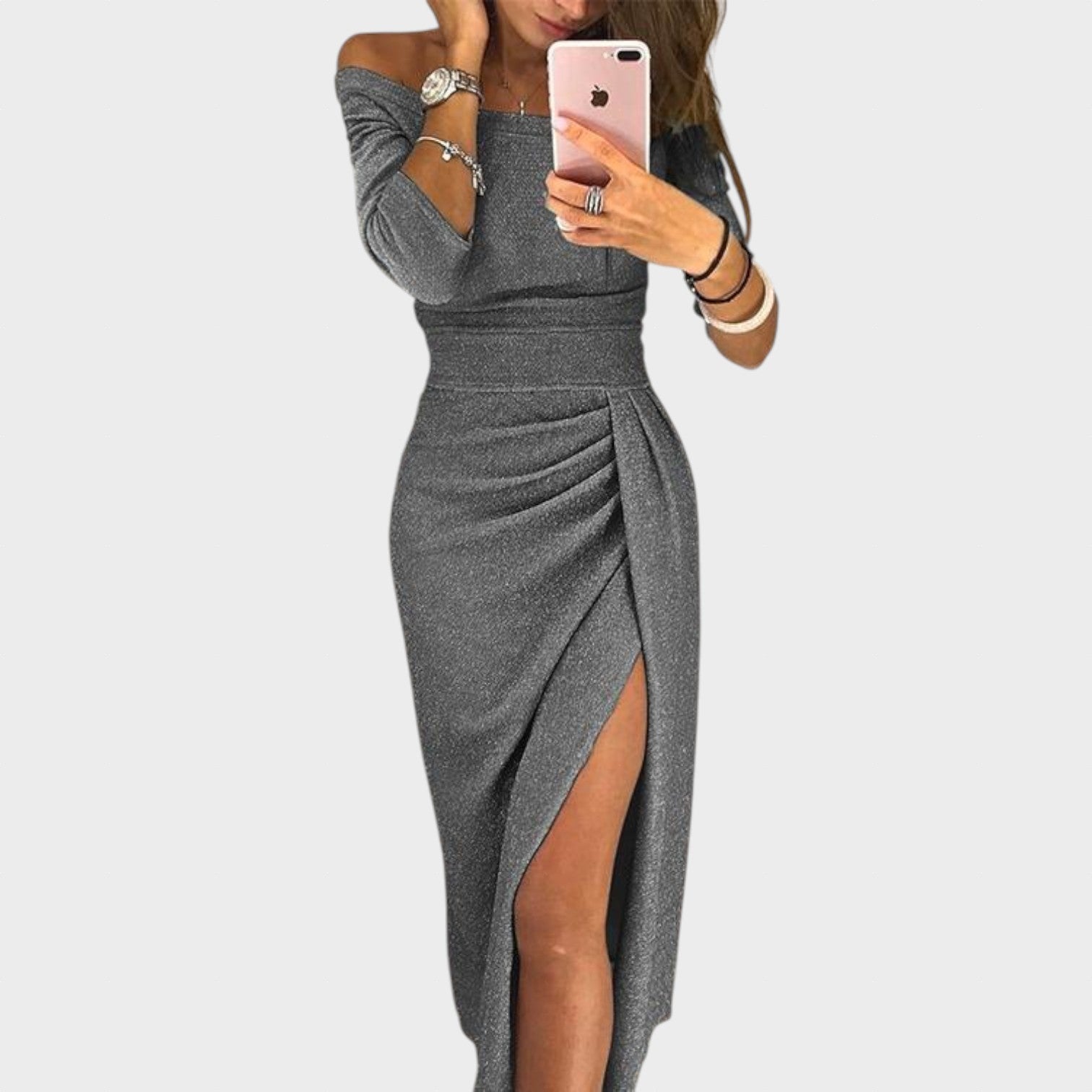 - Nadčasová elegance: střih odhalených ramen a decentní rozparek nabízejí vyvážený mix šarmu a odvahy.