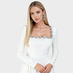 Šaty Eliška - Křišťálové šaty ztělesňují moderní luxus díky siluetě, která spojuje precizní strukturu s ženskou jemností. Prémiová tkanina zajišťuje plynulý pohyb, zatímco výstřih zdobený křišťály dodává nadčasový nádech sofistikovanosti. Tento model není jen o módě – je to sebevědomí a stylu.