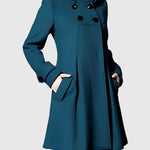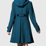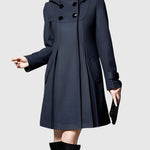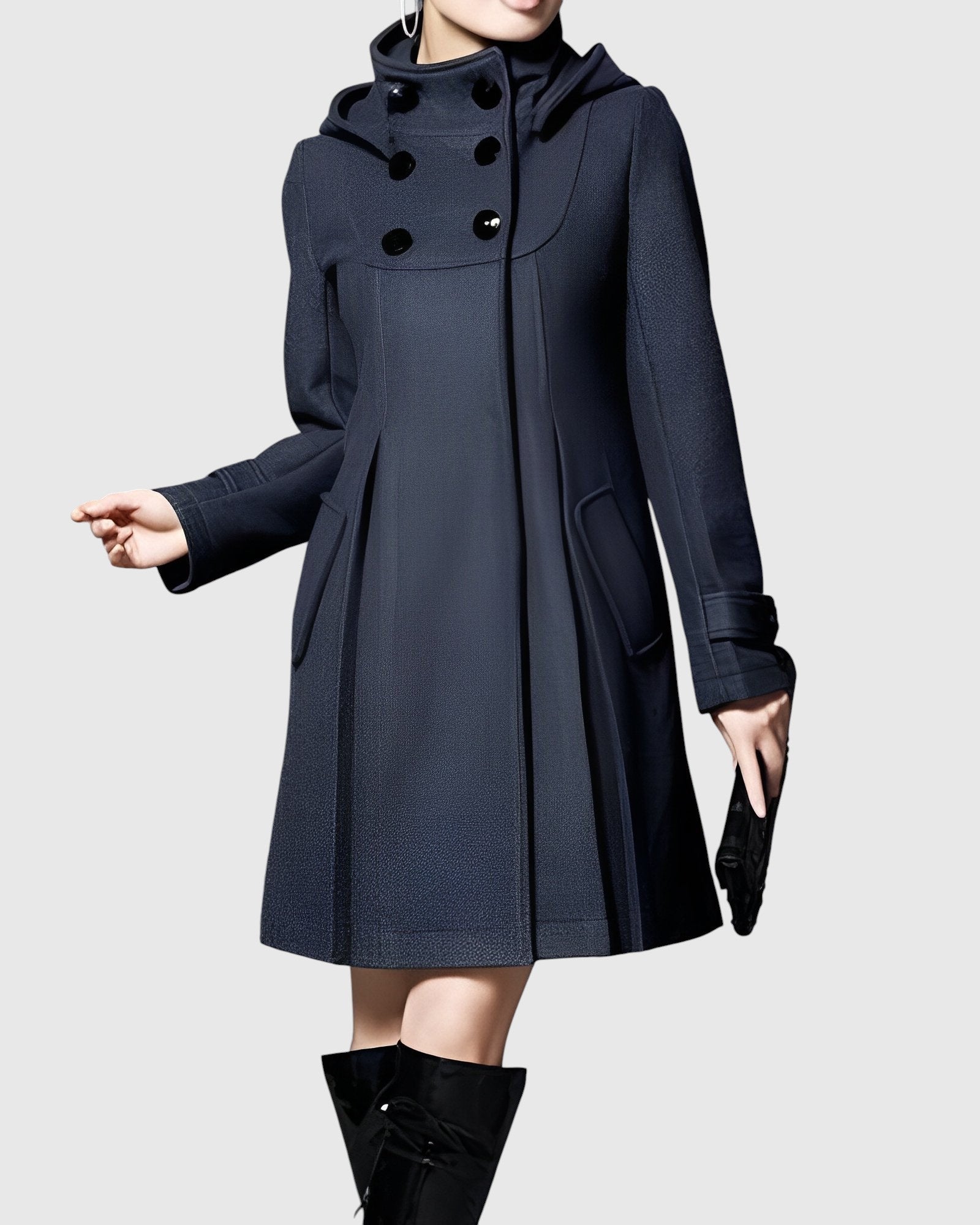 Dámský kabát s rozšířeným (A-line) střihem, vysokým límcem a nastavitelnou kapucí. Vpředu dvouřadé zapínání a praktické kapsy s patkami. Pevnější, měkká tkanina drží tvar bez zbytečné hmotnosti, střední délka opticky prodlužuje siluetu. Manžety s ozdobným páskem, precizní zpracování a pohodlná podšívka. Univerzální volba do města, do práce i na víkend — skvěle ladí se šaty, sukněmi i džíny a vynikne s kozačkami.