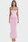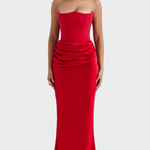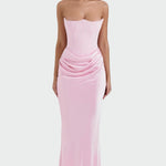 Interesantní a smyslné šaty s bezramínkovým topem a těsným střihem, který zvýrazňuje postavu. Detail v podobě elegantních záhybů v pase dodává šatům ženskost a jedinečný pohyb, zatímco maximální délka jim propůjčuje nadčasovou eleganci. Ideální pro slavnostní večery a zářivé vystoupení.