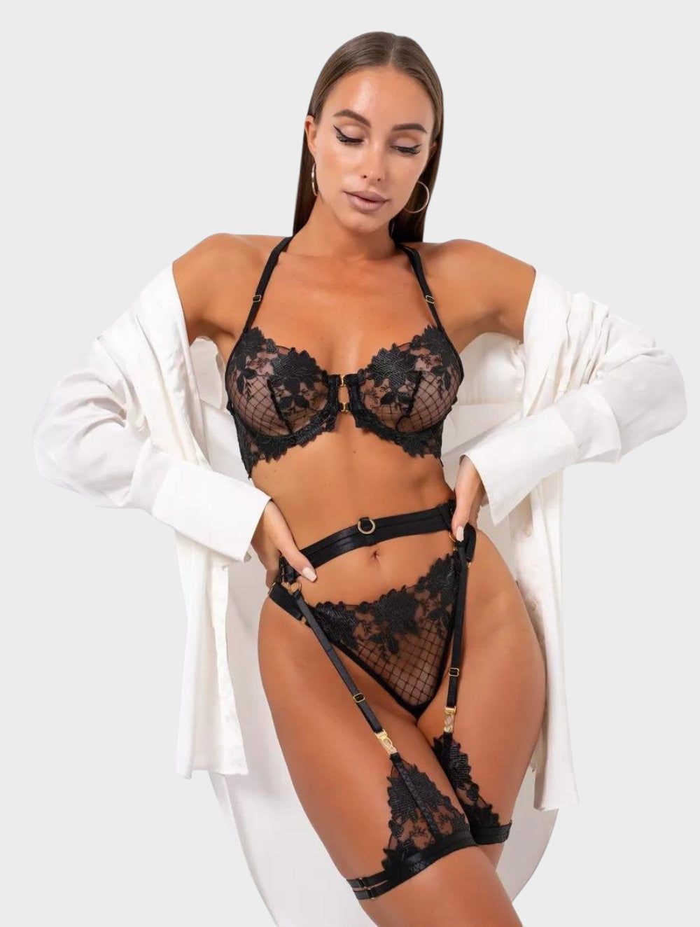 Objevte Maxine | 3-dílnou soupravu spodního prádla, která nabízí dokonalou kombinaci elegance a pohodlí. Tato exkluzivní souprava sexy prádla není jen poutavá, ale také zaručuje příjemný pocit při nošení. Jemná květinová výšivka na měkké síti dodává prádlu luxusní nádech, který je vhodný jak pro romantické večery, tak pro zvláštní příležitosti.
