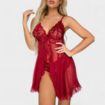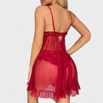 Okouzlující komplet, který spojuje jemnou krajku s průsvitným lehkým materiálem. Košilka s nastavitelnými ramínky a zavazováním pod prsy dokonale zvýrazní dekolt, zatímco volánkový lem dodává hravý a romantický nádech. Součástí jsou i sladěné krajkové kalhotky, které doplňují celý svůdný vzhled.