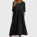 Šaty Sofia vynikají svým minimalistickým, přesto moderním designem. Vyrobené z kvalitní bavlněné směsi, která je jemná, prodyšná a příjemná k pokožce, ideální iv horkých dnech. Střih do áčka s volně padnoucí sukní přirozeně lichotí postavě, zatímco decentní výstřih dodává jemný ženský akcent. Jednoduchost modelu umožňuje snadné stylování – od sandálů po tenisky či doplňky.